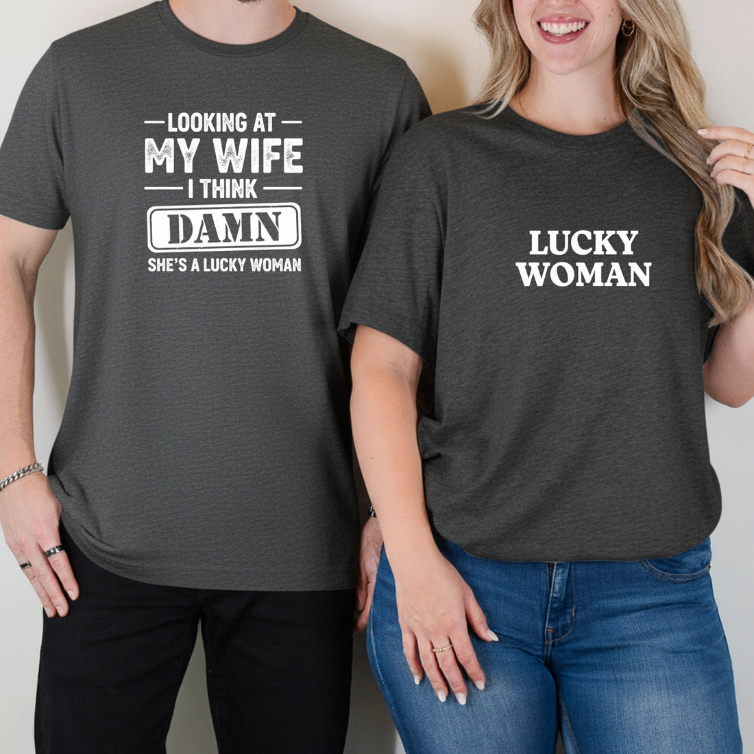 Looking At My Wife I Think Damn She's Lucky Woman Matching T-Shirts For Couples